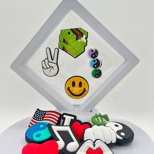 **Note: To ensure the longevity of your charms, insert the peg in at an angle while stretching the shoe and pop in to secure. To remove the charms without harming them, make sure you push/pop them out from the inside of your shoe outwards, applying pressure while pushing out, and stretching the shoe without ripping at the charm. **